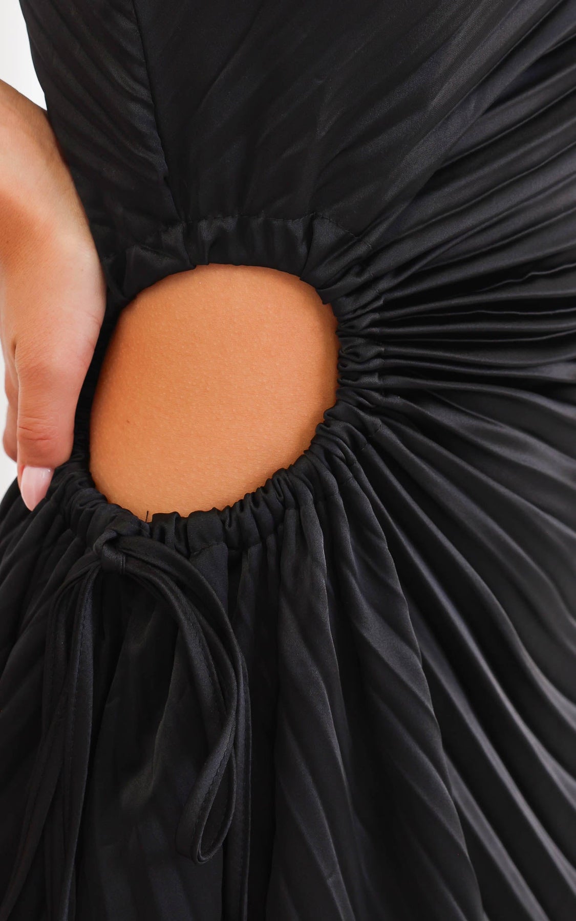 – Left one-shoulder neckline with all-over pleats